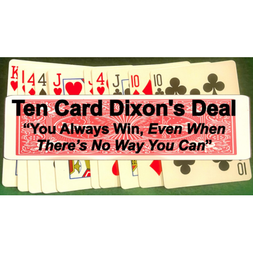 In each round in Dixon’s Deal the magician risks his cash, adding drama & interest. The last round is played with the cards spread face up on the table. The audience member gets to freely choose all five of his cards first, leaving you with the five cards that remain.