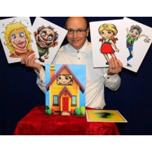 Everything has been vastly updated from the original version. Large 12″ X 9″ cards digitally printed on vinyl and applied to nice, thick stock and laminated. If they get dirty, simply wipe them clean. The house is made from PVC material and the entire routine is extremely easy and fun to perform. All you need to do is concentrate on presentation. Packs flat, plays BIG, super colorful, magical, suspenseful and a routine that the kids will love and enjoy!