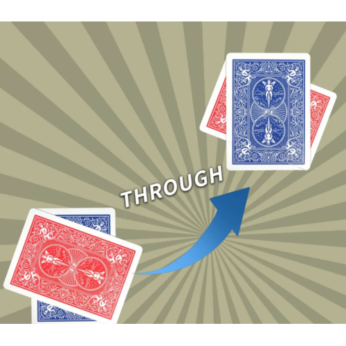 The magician shows two cards, one blue and one red, and then stacks the two cards together. Without any extra movement, the two cards travel instantly!